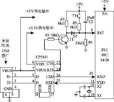 根据IAP编程的原理,作者先后设计了两种接口电路。一种是传统电路IAP工作电路,没有使用CP2101芯片,如图3所示。另一种是利用CP2101设计的IAP工作电路,如图4所示。