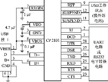 芯片CP2101是一种高度集成的USB转UART桥接器,它包含有USB2.0全速功能控制器、USB收发器振荡器和异步串行接口(UART)。该芯片的全部功能集成在一个5mm×5mm的MLP28封装的IC中。CP2101内置有与计算机通信的USB协议,工作时,会在计算机上产生一个虚拟COM口,用户就可以按照通用串行口的控制方式来使用这个COM口。