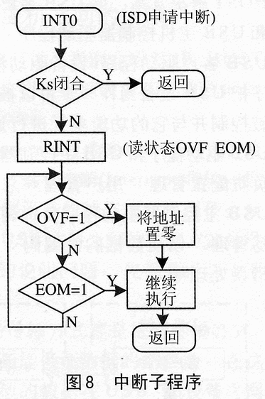 整个程序包括主程序和中断子程序两部分。AT89C51单片机提供了用户键盘、显示和ISD4004所需接口。它接收击键功作,并将相应指令传给ISD4004,同时监控ISD4004的中断输出。当开关KS闭合(KS=1)时,读取ISD4004的状态寄存器,从而根据OVF和EOM的状态进行相应的处理。当OVF=1,即存储器溢出时,则不管当前为何种状态均将ISD4004的地址置零,并继续运行原指令;当EOM=1时,当前状态只可能为放音或快进,若为快进则置为放音态,并继续运行。如此设计便实现了循环录放的功能,同时在快进时,自动停止在下一个语音段开始处,并继续放音。