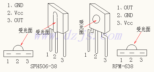 SFH506-38与RPM-638是一种特殊的红外接收电路,它将红外接收管与放大电路集成在一体,体积小(大小与一只中功率三极管相当),密封性好,灵敏度高,并且价格低廉,市场售价只有几元钱。它仅有三条管脚,分别是电源正极、电源负极以及信号输出端,其工作电压在5V左右.只要给它接上电源即是一个完整的红外接收放大器,使用十分方便。
