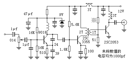这是应网友的要求搭出的一个功放电路,输出功率令人满意,但是也存在很多问题,将在下文详述。振荡器与功放连在一起,就成了一个完整的调频发射机,见下图。