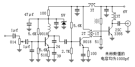 图中的线圈用1.0mm的漆包线在3.2mm的钻头上绕6-8圈,可覆盖88-108MHz,7圈时在100MHz附近。按上图连接好,其实就已经是一个简单的发射机了,通电即可发射,不过发射的是未经调制的等幅信号,附近的调频收音机接收到信号只会出现静音。像下图那样加上调制信号,就可进入实用状态了。