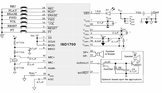 三、独立按键工作模式 ISD1700 的独立按键工作模式录放电路非常简单(后附图),而且功能强大。不仅有录、放功能,还有快进、擦除、音量控制、直通放音和复位等功能。这些功能仅仅通过按键就可完成。 在按键模式工作时,芯片可以通过 LED 管脚给出信号来提示芯片的工作状态,并且伴随有提示音,用户也可自定 4 种提示音效。 录音操作: 按下 REC 键, REC 管脚电平变低后开始录音,直到松开按键使电平拉高或者芯片录满时结束。录音结束后,录音指针自动移向下一个有效地址。而放音指针则指向刚刚录完的那段语音地址。 放音操作 : 放音操作有两种模式,分别是边沿触发和电平触发,都由 PLAY 管脚触发。 A )边沿触发模式: 点按一下 PLAY 键, PLAY 管脚电平变低便开始播放当前段的语音,并在遇到 EOM 标志后自动停止。放音结束后,播放指针停留在刚播放的语音起始地址处,再次点按放音键会重新播放刚才的语音。在放音期间, LED 灯会闪烁直到放音结束时熄灭。如果在放音期间点按放音键会停止放音。 B )电平放音模式: 如果一直按住 PLAY 键,使 PLAY 管脚电平持续为低,那么会将芯片内所有语音信息播放出来,并且循环播放直到松开按键将 PLAY 管脚电平拉高。在放音期间 LED 闪烁。当放音停止,播放指针会停留在当前停止的语音段起始位置。 快进操作: 点按一下 FWD 按钮将 FWD 端拉低,会启动快进操作。快进操作用来将播放指针移向下一段语音信息。当播放指针到达最后一段语音处时,再次快进,指针会返回到第一段语音。当下降沿来到 FWD 端时,快进操作还要决定于芯片当时的状态: 如果芯片在掉电状态并且当前播放指针的位置不在最后一段,那么指针会前进一段,到达下一段语音处 如果芯片在掉电状态并且当前播放指针的位置在最后一段,那么指针会返回到第一段语音处。 如果芯片正在播放一段语音(非最后一段),那么此时放音停止,播放指针前进到下一段,紧接着播放新的语音。 如果芯片正在播放最一段语音,那么此时,放音停止,播放指针返回到第一段语音,紧接着播放第一段语音。擦除操作: