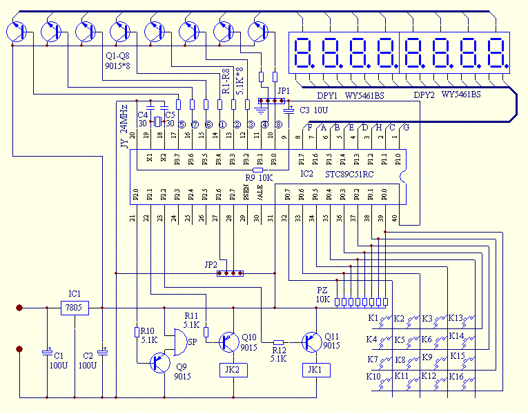 单片机控制板,使用T89C51、52、STC89C51、52等相兼容单片机芯片。需要你自己写程序。主要控制电路由一个STC89C51RC单片机芯片来完成。电源经C1滤波,三端稳压集成电路7805稳压,再经C2滤波,得到稳定的约5V的直流电给整机供电。P0口做矩阵按键,共可接16个按钮开关,做设置、启动/停止、预置数输入等;P1口和P3口做数码管显示驱动,P3口8个限流电阻分别接到8个驱动三极管的基极,控制8个数码管的选通。P1口接到8个数码管的公共段选引脚上。采用扫描显示法,先选通第一个数码管,然后再在P1口上输出要显示的数的段码信号,延时一段时间后,关掉第一位数码管,再选通第二位数码管,在P1口上输出第二位数码管要显示的数的段码信号,延时一段时间后,关掉第二位数码管,再选通第三位。。。P2.0经5.1K的电阻接三极管放大推动蜂鸣器发声,P2.1和P2.2也是经5.1K电阻后分别接三极管放大驱动两个继电器,一个用来控制电机的启动和停止,一个用做制动的,防止惯性使电机不能及时停止,使记数超过预置数。
