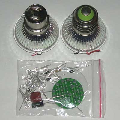 套件说明,罗口的电镀玻璃反光灯杯1只、圆型透明的平面封口玻璃1块、0.8mm高精度双面电路板1块、高亮白光草帽灯19只、400V224高压金属膜限流电容1只、1N4007整流二极管4只、4.7M高压泄流电阻1只、63V10UF消闪烁用滤波电容1只。