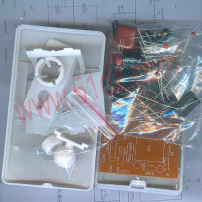 热释电人体红外感应开关套件:外壳,元件,电路板,原理图及原理说明,安装说明等。采用高灵敏度红外探头,探测距离最远可达10米左右。本电路由热释电红外传感与菲涅尔透镜组成红外探测信号输入电路,一级低通同相放大器IC1A,一级低通反相放大器IC1B,一级比较器IC1C,一级单稳态延时器IC1D以及输出驱动和继电器控制电路组成。热释电红外传感器受到触发时,输出0.1-10Hz幅度不超过1MV的超低频脉冲,两个低通放大器组成低频带通放大器,其带宽为相端,使IC1D输出低电平,继电器工作。当传感器输出信号消失后,IC1C的输出脚恢复高电平,电源通过RP1向C9充电,充电过程使继电器保持吸合一段时间,直至充电电压大于比较电压,调节RP1可改变继电器工作时间。