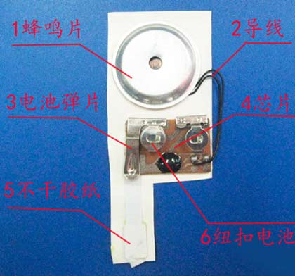 生日歌贺卡套件包含:1、芯片 2、蜂鸣片 3、导线2条 4、弹片2个  5、纽扣电池2粒(学生通过自己焊接 可以组装成生日贺卡